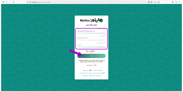 ایمیل و شماره تماس خود را وارد کرده و درخواست بازیابی کلمه عبور کنید.